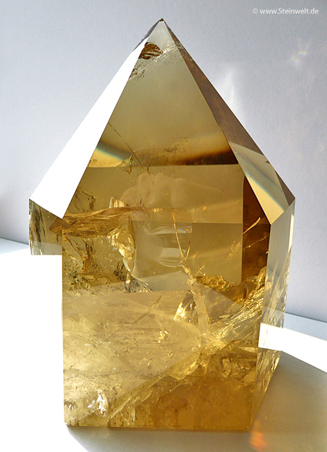 Der Kristall ist ein 100% Natur-Citrin und nicht aus dem im Handel ebenfalls erhältlichen gelbgrünen Lemonquarz. Dieser wird häufig durch Bestrahlen oder Erhitzen von hellem Amethyst hergestellt.