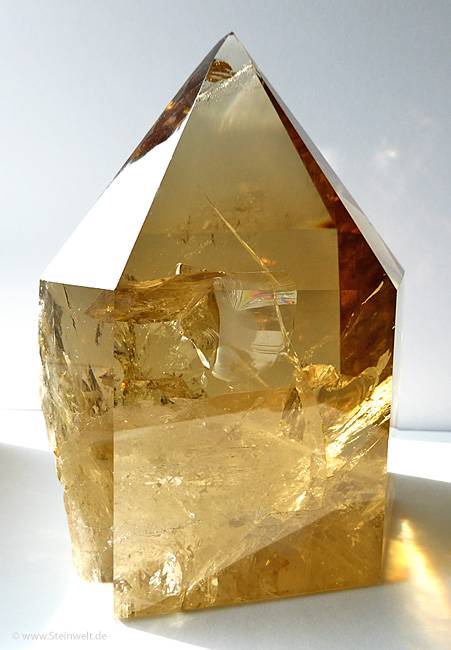 Wunderschöne und handpolierte Natur-Citrin Spitze aus Brasilien. Dieser hochwertige Einzelkristall ist eine echte Rarität, er ist von absoluter Spitzenqualität und besitzt eine sagenhafte Transparenz. Auf dem seitlichen Foto gut zu erkennen, ist die damalige Anwuchstelle an seine Kluft. Es handlet sich hier nicht um eine Bruchstelle, sondern um die ursprungliche Verbindung zur Kluft in welcher der Kristall aufgewachsen ist. Die Kombination von brillant und ursprünglich gibt diesem Citrin eine ganz besondere Note. Wir haben nur wenige Stücke pro Jahr in dieser beindruckenden Qualität und Größe.