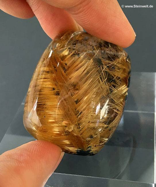 Sehr seltener und bestechend schöner Goldrutilstern aus Novo Horizonte, Brasilien. Dieser atemberaubend hochwertige und absolut brillante Stein lässt keine Wünsche offen. Sie können ihn als edlen Schmuck tragen oder als seltenes Sammlerstück in Ihrer Vitrine präsentieren. Wenn Sie dieses wunderbare Exemplar ins Sonnenlicht halten, eröffnet sich Ihnen ein einzigartiger Mikrokosmos aus unzähligen, funkelnden Goldrutilen. Jeder der schon einmal eines dieser Naturwunder in der Hand gehalten hat, weiss wovon wir schwärmen. Es gibt weltweit nur sehr wenig dieser wunderbaren Sterne. Ein echtes Sammlerstück und einzigartiges Mineral.