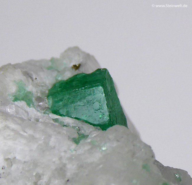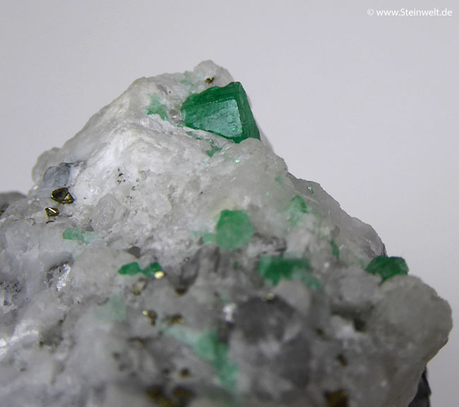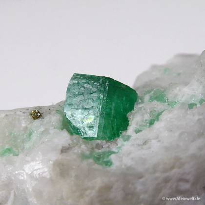 Ein bestechend schöner und intensiv leuchtend grüner Smaragd auf seinem Calcit-Muttergestein (Matrix). Dieser ästhetisch gewachsene und beindruckende Kristall kommt aus der wohl bekanntesten Mine Kolumbiens, der Muzo Mine. Der Kristall hat intakte Endflächen und misst die Höhe 6,8mm x Breite 8,0mm x Tiefe 6,6mm, dies ist bereits eine ordentliche Größe für einen farbintensiven Smaragd. Das schneeweiße Calcit Muttergestein ist durchzogen von golden glänzenden Pyrit Kristallen und bietet einen wunderschönen Hintergrund für dieses grüne Naturwunder. Der Smaragd gehört zur Beryll-Gruppe und ist weltweit einer der begehrtesten Edelsteine.