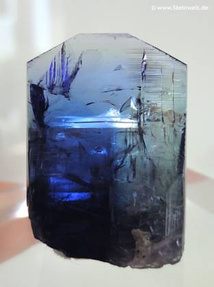 Ein bestechend schöner Tansanit aus Afrika. Dieser brillante Kristall zeigt einmalig schön den Übergang des gelb grünen Zoisit in den blauen Tansanit. Der Kristall besitzt die beim Tansanit so beliebte Mehrfarbigkeit, auch Pleochroismus genannt - damit ist der Farbwechsel von blau zu violett zu rot-violett gemeint.