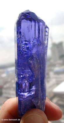 Ein bestechend schöner und beindruckend großer Tansanit aus Afrika. Dieser ästhetisch gewachsene und in Teilbereichen sehr klare Tansanit Kristall aus den Merelani Hills in Afrika hat eine wunderbare blaue Farbe. Er ist naturbelassen und in Teilbereichen zum Verschliff (facettierten als Schmuckstein) geeignet. Aber gerade unversehrt und als Sammlerstück ist er ein echter Hingucker und sollte in keiner hochwertigen Sammlung fehlen. Der Kristall besitzt die beim Tansanit so beliebte Mehrfarbigkeit, auch Pleochroismus genannt - damit ist der Farbwechsel von blau zu violett zu rot-violett gemeint.