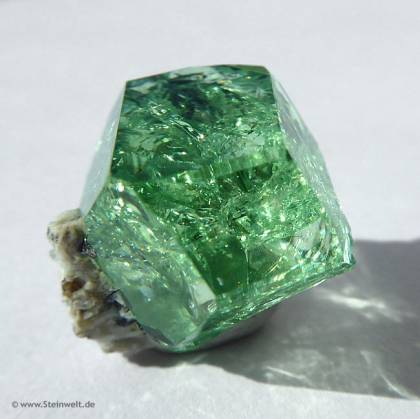 Ein bestechend schöner und klarer Tsavorit aus Afrika. Dieser ästhetisch gewachsene und beindruckende Kristall aus den Merelani Hills in Afrika hat eine wunderbare intensiv leuchtend grüne Farbe. Der Tsavorit ist ein Granat der Grossular-Gruppe und erhält seine einzigartige Farbe durch Anteile von Chrom und Vanadium. Er ist seltener als der Diamant, geschliffene Schmucksteine über 5 Karat in feiner Qualität sind sehr rar und teuer.